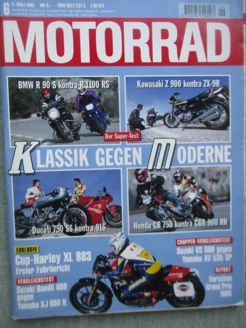 Motorrad 6/1995 Tst und Technik: Chopper Vergleichstest: Yamaha XV535 und Suzuki VS 600, Fahrbericht MV Agusta-Replica, VGT: Suzuki GSF 600 Bond vs. Yamaha YJ 600N,Gebrauchkauf Kawasaki UN 750, Generationenvergleich BMW R90S und R1100RS,Ducati 750 Supersport und 916 Strada,Honda CB 750 Four und CBR 900 RR,Kawasaki Z900 und ZX-9R,gebrauchtes Heft