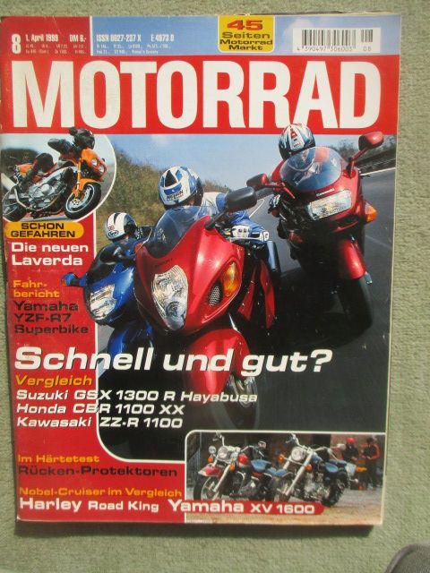Motorrad 8/1999 test & technik Vergleichstest Honda CBR 1100XX und Kawasaki ZZ-R 1100 und Suzuki GSX 1300-R,VGT Cruiser:Harley-Davidson Road King Classic vs. Yamaha XV 1600 Wild Star, VGT:Yamaha FZS 600 Fazer vs. Yamaha TDM 850, Präsentation Laverda, Gebrauchtkauf Suzuki GSF 600 Bandit,gebrauchtes Heft