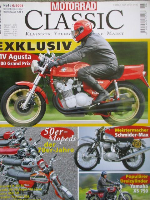 Motorrad Classic 6/2005, MV Agusta 1100 Grand Prix,BMW R80 G/S,Yamaha XS750,MZ RE250,Suzuki GT750,Laverda SFC,Hercules K50SL, Honda SS50 Super de Luxe und Maico MD50, Kreidler Florett RSL und Zündapp KS 50 Supersport,gebrauchtes Heft.