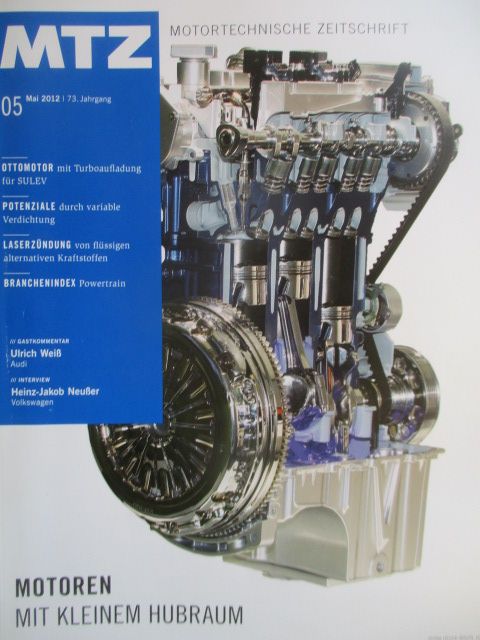 MTZ 5/2012 Motoren mit kleinem Hubraum, Dreizylinder-Ottomotoren mit Direkteinspritzung und Turboaufladung, BMW 2.0l Vierzylinder Ottomotor mit Turbaufladung für SULEV,Hybridantriebe,gebrauchtes Heft.