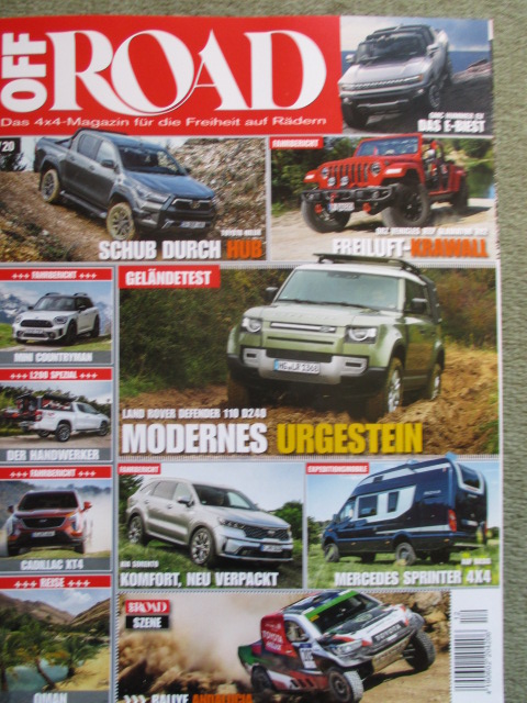 Off Road 12/2020 Defender 110 D240,Mini Cooper SE Countryman,Sorento 2.2CRDI,Hilux 2.8D-4D,ORZ Jeep Gladiator 392,Cadillac XT4 350D AWD,Volvo XC60 B4 AWD,Land Rover Discovery Si4,neuwertiges Heft.