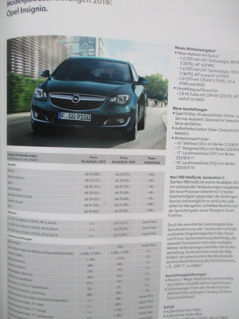 Opel Produktinformation Modelljahr 2016 Modelle:Adam,Corsa,Meriva,Cascada,GTC und GTC OPC,Astra Limousine, Astra Sports Tourer,Zafira Tourer,Insignia,Mokka,43 Seiten stark, intern,nur für den Verkauf gedacht.