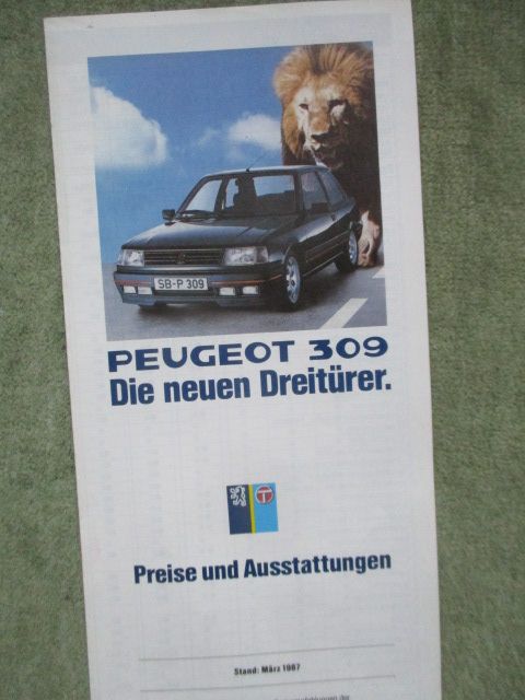 Peugeot 309 Preisliste März 1987, die neuen 3-türer,XE,XL, Diesel, Profil,XR, Injection,GTi +Kat, sehr selten.