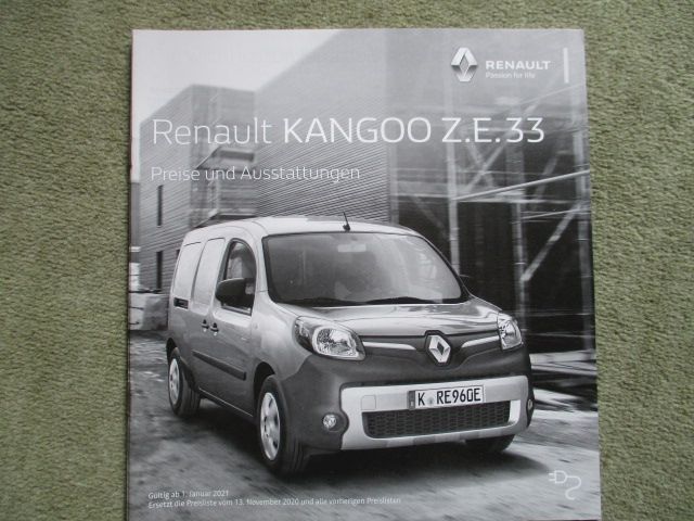 Renault Kanggo Z.E. 33 +Maxi Preisliste 44kw 2-sitzer 5-sitzer doppelkabine Januar 2021,15 Seiten stark.