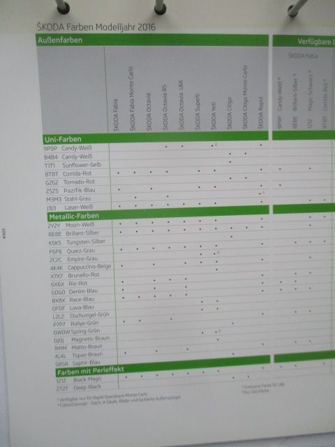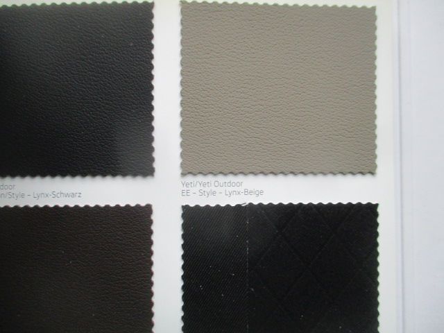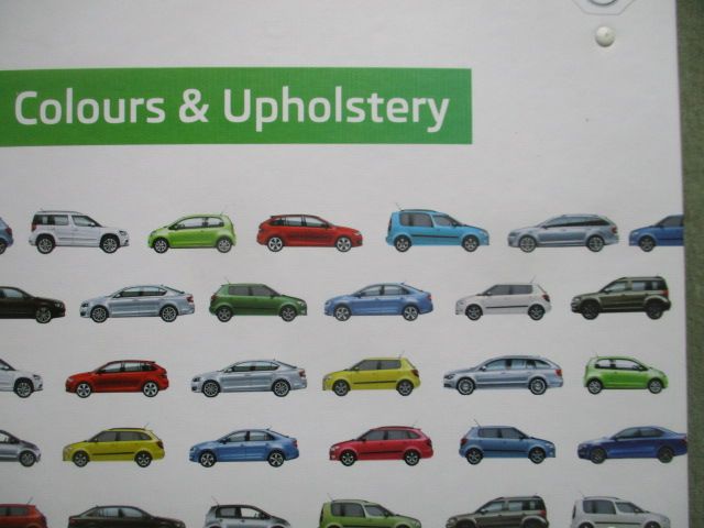 Skoda Farben Modelljahr 2016,Modelle: Citigo,Rapid, Yeti, Superb, Octavia,Fabia, Farbliste, Muster Stoff Sitzbezüge Sportsitze, nur für Verkäufer gedacht, sehr selten.