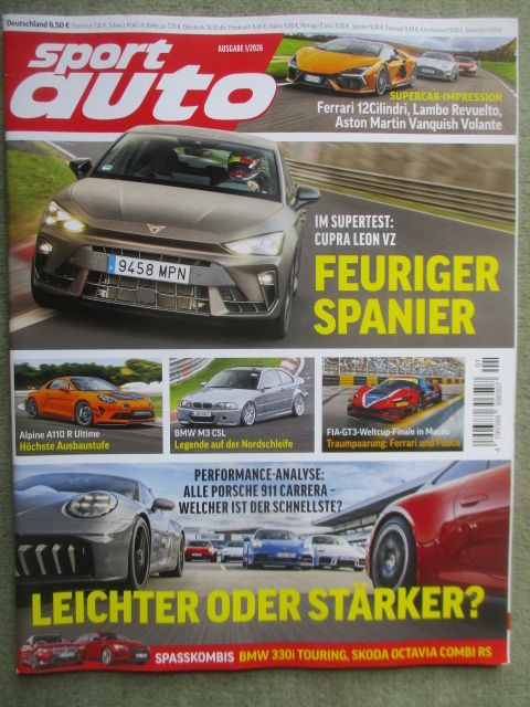sport auto Januar 2026 Vergleichstes Ferrari 12Cilindri vs. Aston Martin Vanquish Volante vs.Lamborghini Revuelto, Alpine A110 R Ultime,Cupra Formentor VZ5,Opel Mokka GSE,Cupra Leon VZ Extreme, BMW 330i xDrive Touring G21 vs. Skoda Octavia RS,Porsche 911 Carrera, Toyota GR Yaris,BMW M3 CSL E46, Mercedes-AMG C63 T-Modell,Opel Speedster Turbo, neuwertiges Heft