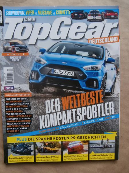 Top Gear 3-4/2016 Pagani vs. Koenigsegg,Audi Sport Quattro,Porsche 911 Turbo S,RAV4 Hybrid, Kia Sportage,Beetle Dune,Land Rover Defender 110 Station Wagon,Ssangyong Tivoli, Subaru Levorg 1.6 GT Sport,Ligier JS50L,AMG C 63 S T-Modell BR205,GLS 350d,BMW 640i Cabrio,RX450h,Mégane GT,Tesla Model S,VW Passat Variant GTE,Ford Focus RS,Paganie Zonda LM,Kei Cars,Ferrari F12 TDF,Peugeo 308 R Hybrid,Mercedes Benz C111,BMW i8 Spyder,gebrauchtes Heft, Deutsche Ausgabe.
