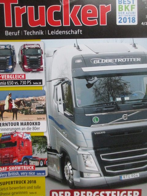 Trucker 4/2018,Volvo FH540 Dual Clutch,Supertest: Volvo FH540, Vergleich:Scania S730 und S650, gebrauchtes Heft,Deckblatt beschädigt.