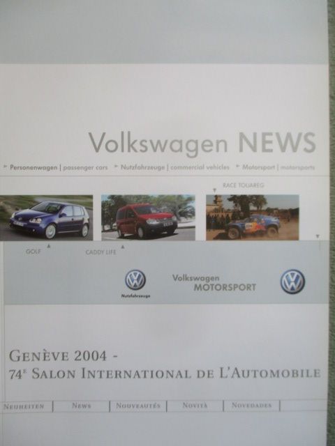 VW Genf 2004, Modelle: Polo,Golf,New Beetle Cabriolet, Touran, Passat,Touareg, Phaeton alle Versionen, Caddy Live, Individual GmbH und Motorsport, 22 Seiten stark,selten.