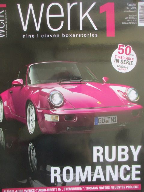 werk 1 2-2024, 2008er 91 GT3 Cup (997), 88iger 911 Carera 3.2 coupe G50, 2024er STROSEK Mega 30 Jahre auf 964 Carrera, 85iger 930 turbo 3.3 cupe, Porsche 959, 993 Targa, Carrera RS 2.7 coupe M471, Carrera GT (980), der Malardeau Kremer Porsche 917 K/81, schönes Heft