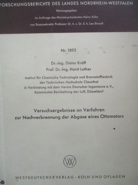 Westdeutscherverlag Versuchsergebnisse an Verfahren zur Nachverbrennung der Abgase eines Ottomotors, von Dr.-Ing. Dieter Kräft und Prof.D.-Ing. Horst Luther,1969, 45 Seiten stark,sehr selten.